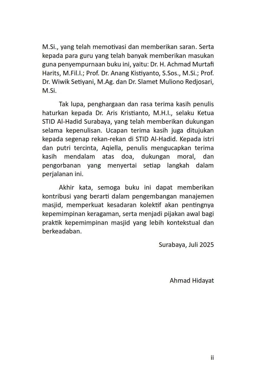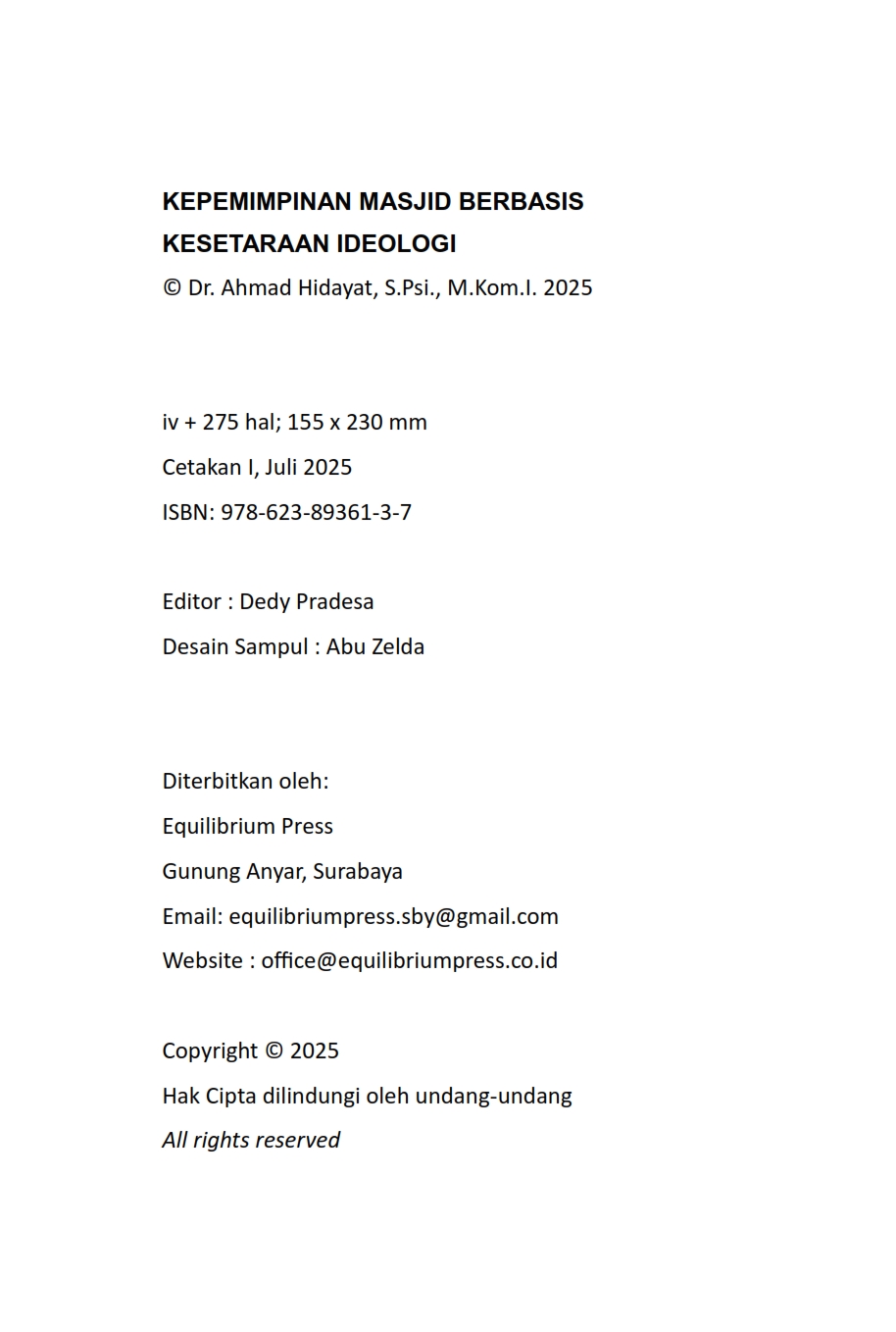 Dalam lanskap sosial keagamaan yang kian beragam, masjid sering kali menjadi titik temu berbagai ideologi keagamaan umat Islam. Namun, penerapan kepemimpinan masjid yang hanya berpijak pada satu ideologi tertentu kerap menimbulkan konflik, eksklusivitas, dan ketimpangan dalam pengelolaan masjid, terutama pada masjid-masjid yang dibangun secara gotong royong oleh masyarakat yang beragam atau pada fasilitas umum milik instansi. Buku ini menawarkan alternatif segar: Kepemimpinan Masjid Berbasis Kesetaraan Ideologi (KMBKI). Berdasarkan studi lapangan di Masjid Al-Huda dan Masjid Al-Madani, buku ini mengungkap bagaimana pola kepemimpinan yang inklusif dan mengakui keragaman ideologi keagamaan mampu menciptakan harmoni, kemakmuran, dan keterlibatan kolektif dalam kehidupan masjid. KMBKI tidak hanya menjadi konsep, melainkan juga telah teruji secara praksis dalam dua model berbeda—masjid gotong royong dan masjid fasilitas umum. Dengan pendekatan teoritis dari Lussier-Achua dan James Coleman, serta metode penelitian kualitatif yang mendalam, buku ini membedah model kepemimpinan kolektif-kolegial dan delegatif, serta proses transformasi dan institusionalisasi yang memungkinkan pola kepemimpinan ini tumbuh dan berkelanjutan. Di balik semua itu, nilai-nilai teologi inklusif dan ukhuwah Islamiyah menjadi fondasi spiritual yang menggerakkan perubahan. Sangat relevan bagi pengurus masjid, akademisi, dan siapa saja yang peduli pada masa depan masjid sebagai ruang publik umat yang inklusif, harmonis, dan berkeadilan.